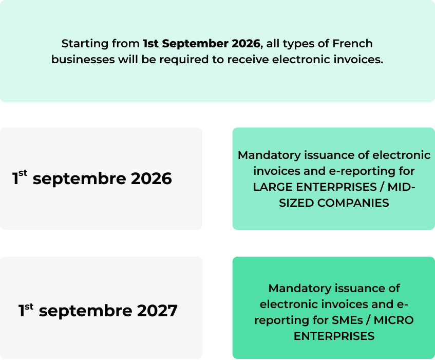 In France, all businesses must adopt electronic invoicing by 1st September 2026 for the receipt of invoices and starting in 2027 for issuing invoices, depending on the size of the business.